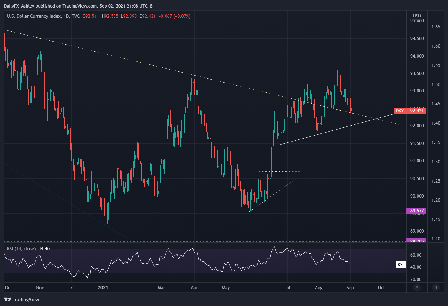 日线图上,美元指数似乎在6月16日突破上升三角形形态後,开始构筑一条潜在上行趋势线。若未来美元指数跌破前述支撑水平,则有望在这一潜在上行趋势线附近寻得进一步支持。