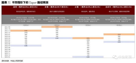 我们在报告《美联储Taper指南》中设想了Taper的四种可能路径,并给出了对应的主观概率。8月非农数据公布后,我们维持基准情形不变,同时下调前置情形的概率,上调基准、后置、“急刹车”情形的概率(图表7)。