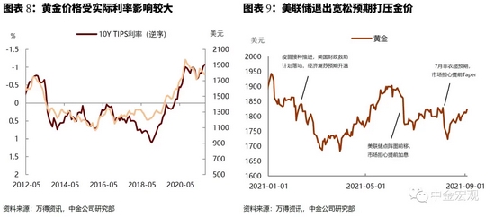 疫情冲击具有“滞胀”效应,会形成有利黄金的宏观环境。黄金定价的一个主要逻辑是看实际利率(图表8)。在“滞胀”环境下,假设货币当局不做反应,那么给定名义利率,通胀预期抬升将压制实际利率,对黄金价格形成支撑。近期黄金上涨反映的就是上述逻辑。一方面,美联储受非农就业放缓的影响对Taper犹豫不决;另一方面,工资增速上升加大市场对通胀的担忧。两股力量叠加,支持黄金价格上涨。