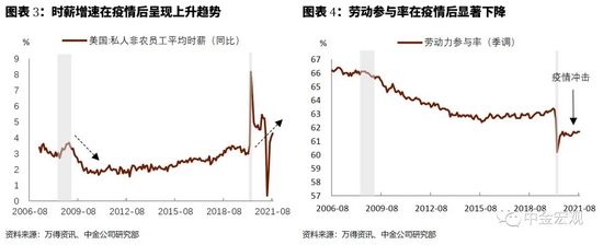 其次,在就业放缓的同时,工资增速进一步上升。8月时薪环比增长0.6%(季调,下同),高于7月的0.4%,同比增速也上升至4.3%(图表3)。分行业看,酒店与休闲业时薪环比增长1.3%,零售业环比增长0.7%,都较上月显著提升。其他受疫情影响较小的行业,平均工资也在上升,说明工资上涨可能是普遍性的。这与2008年次贷危机后工资增速下降的趋势是相反的。