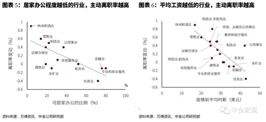 从供给看,疫情会降低了劳动者的就业意愿。8月劳动参与率维持61.7%的水平不变,说明即使面对更高的工资,劳动者也不大愿意出来工作(图表4)。一个解释是,人们不愿意在健康风险上升的环境下工作,尤其是那些工资水平低、对“面对面”服务依赖度高的行业,工作意愿会更低。我们发现,疫情后酒店与休闲业、零售业的主动离职率相对于疫情前的上升幅度比其他行业更大,说明相较于其他行业,劳动者更不愿意从事这两个行业的工作(图表5、图表6)。