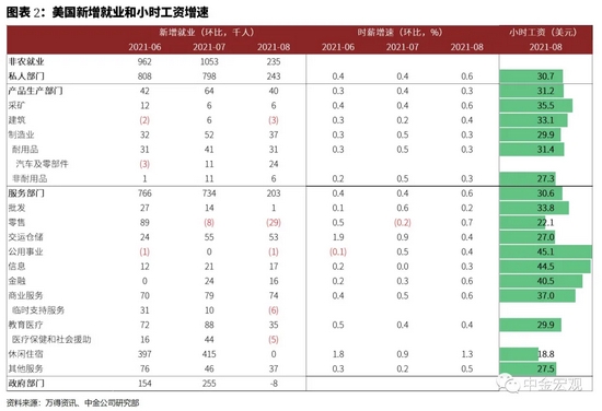 首先,受Delta疫情影响,就业增长显著放缓。8月新增非农就业仅为23.5万人,较7月的105万人显著下降(图表1)。分行业看,与外出相关的接触性服务业放缓较多(图表2)。其中,酒店与休闲业就业零增长(7月为+41.5万人),零售业就业下降约3万人。这两个行业加起来比7月少增44.5万人,贡献了环比少增人数(约82万)的一半以上。