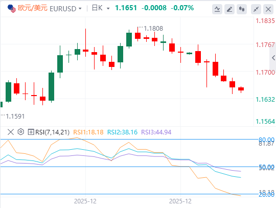 日线图显示,相对强弱指数自11月底以来首次跌破50水平,且汇价连续四个交易日收于20日移动均线下方,反映看跌压力有所积聚。若欧元/美元确认跌破当前位于1.1665的100日简单移动均线并使其转为阻力,后续可能进一步下探1.1600(整数关口)及1.1560(200日均线)。上行方面,1.1740(20日均线)构成近期动态阻力,若能有效突破,则可能打开向1.1800及1.1870反弹的空间。