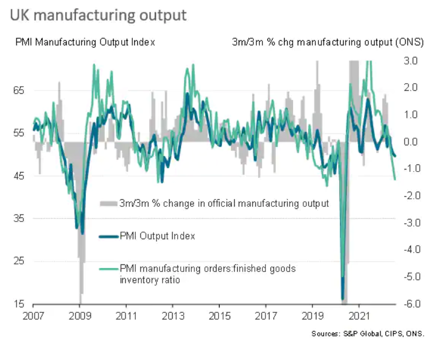 总体来看,除封锁月份外,新订单增长仍是大流行期间最弱的,这反过来导致了2021年2月以来的首次工作积压量下降。请注意,积压工作的减少通常会导致企业重新评估其运营能力需求,这意味着未来几个月产出和就业都有下降风险,除非新订单流入恢复。