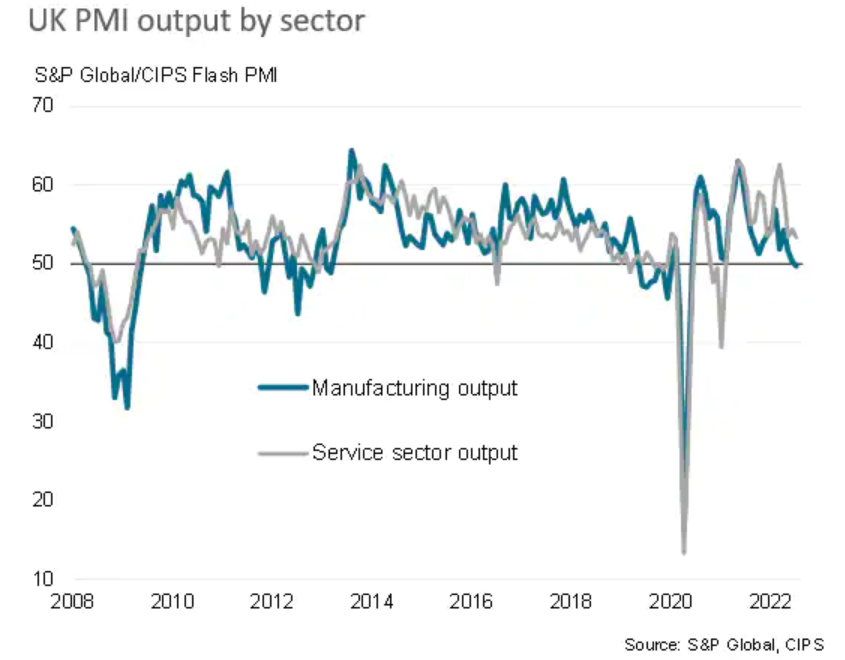 英国私营部门企业的商业活动在7月份连续第17个月增长,但扩张速度是同期最弱的。经季节调整的整体标准普尔全球/ CIPS Flash英国综合产出指数7月录得52.8,低于6月的53.7,是自2021年2月大流行封锁以来的最低读数。