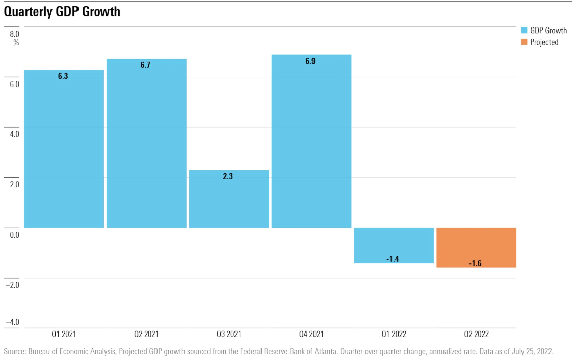 事实上,我们可能会从周四的GDP数据中发现,美国经济在第二季度已经进入衰退,至少从一个定义来看是这样。亚特兰大联储预计,继第一季度年化下降1.6%之后,第二季度实际GDP将收缩0.4%(年化1.6%)。