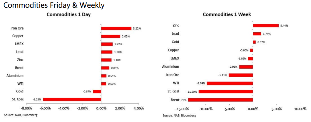 劳动力市场如此强劲,或许衰退永远不会真正到来?(另外,根据FactSet的数据,美国第二季度财报中,75%的公司收益超出预期,平均高出预期3.4%)。非必需消费品类(-1.7%)是周五标准普尔500指数中表现最差的板块,与整体市场走势相比更符合衰退信号,但能源板块(+2%)抵消了部分影响,WTI原油上涨47美分,布伦特原油上涨80美分。当晚商品价格涨跌互现,但铜价上涨1.85%,铁矿石期货上涨5%。