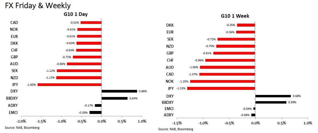 加元的表现不像其他10国集团货币那样糟糕,美元兑加元只上涨了0.5%,这得益于强劲的油价,但加拿大劳动力市场下跌的消息喜忧参半(失业率保持在4.9%,预期上升至5.0%,但就业——加拿大一个非常嘈杂的数字——下降了30.6万,预期上升至15.0万)。周五的整体外汇走势,美元指数DXY +0.88%,将美元从原本下跌的一周中拯救出来(以+0.68%结束)。