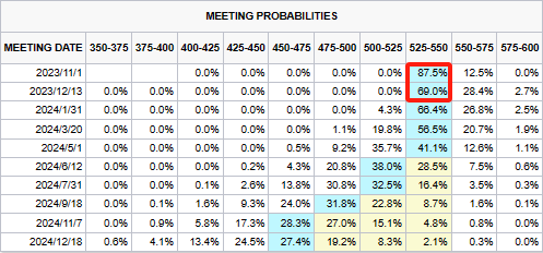 市场一直在降低对美联储进一步加息的预期,根据CME Group旗下的Fed watch数据,美联储在即将到来的10月31日至11月1日会议上加息的可能性目前已降至10%左右。