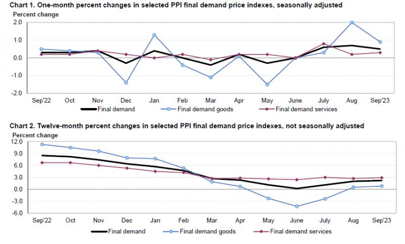 从最终需求服务来看,9月份最终需求服务指数上涨0.3%,较8月的0.2%反弹。9月最终需求服务价格上涨的主要因素为存款服务(部分)指数大幅上涨13.9%。高利率(和通货膨胀)导致更高的利率(和通货膨胀)。