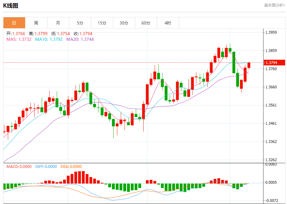 截至目前,美元/加元上涨0.20%,报1.3796。