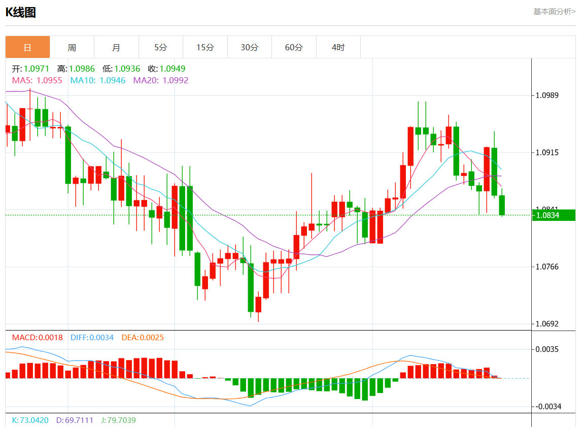 周五欧市盘中,欧元/美元最新报1.0833,日图跌0.24%.