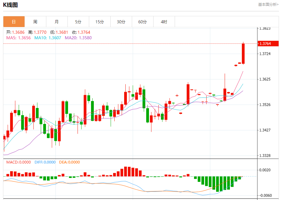 截至目前,美元/加元上涨0.55%,报1.3765。
