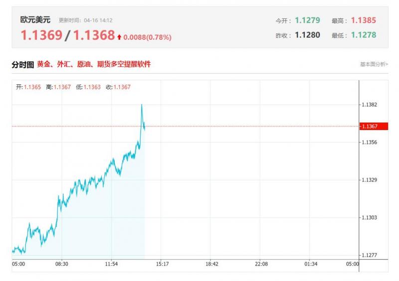 截至目前,欧元/美元上涨0.78%,报1.1368。