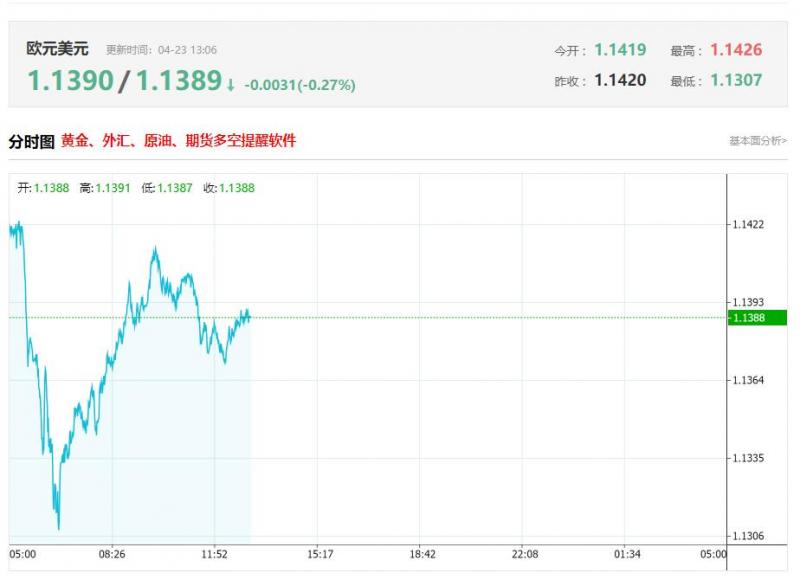 截至目前,欧元/美元下跌0.27%,报1.1389。
