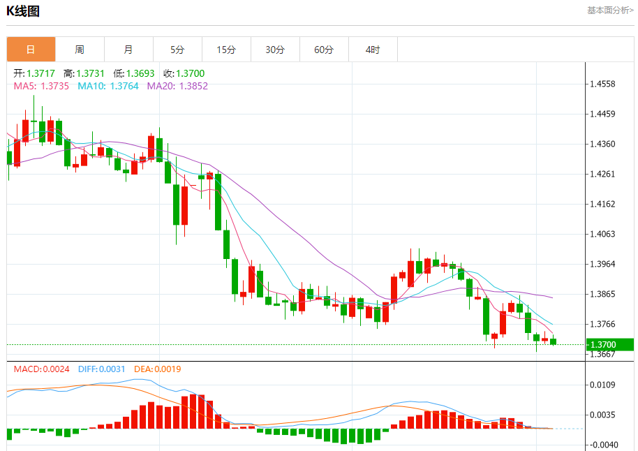 截至目前,美元/加元下跌0.12%,报1.3703。