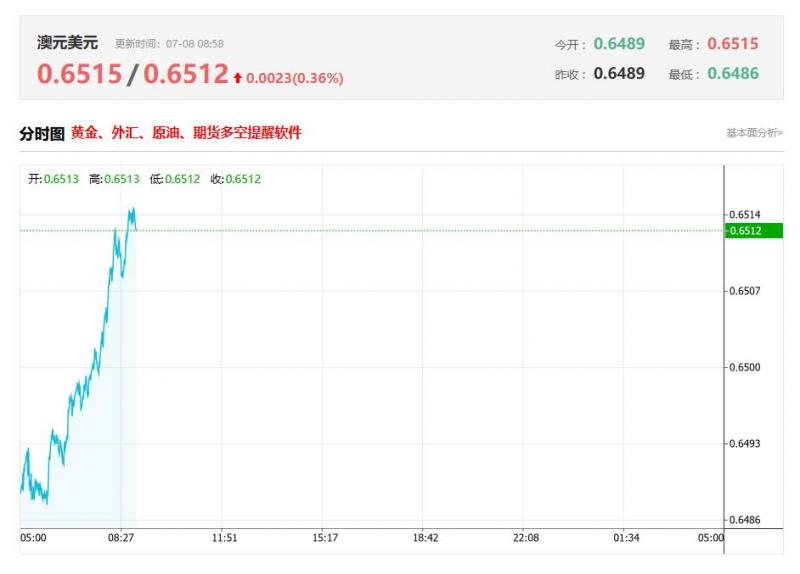 截至目前,澳元/美元上涨0.36%,报0.6512。