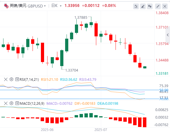 英镑/美元货币对在短期内超卖,但没有技术迹象表明它会改变方向。该货币对在1.3370区域有直接支撑,该区域在6月份触底,跌破该区域将为更陡峭的跌至1.3300关口打开大门。仅仅因为英国CPI数据而不太可能进一步下降,但在与风险相关的催化剂下可能会进一步下降。