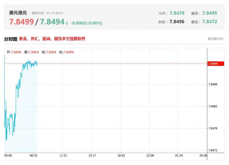截至目前,美元/港元下跌0.01%,报7.8494。