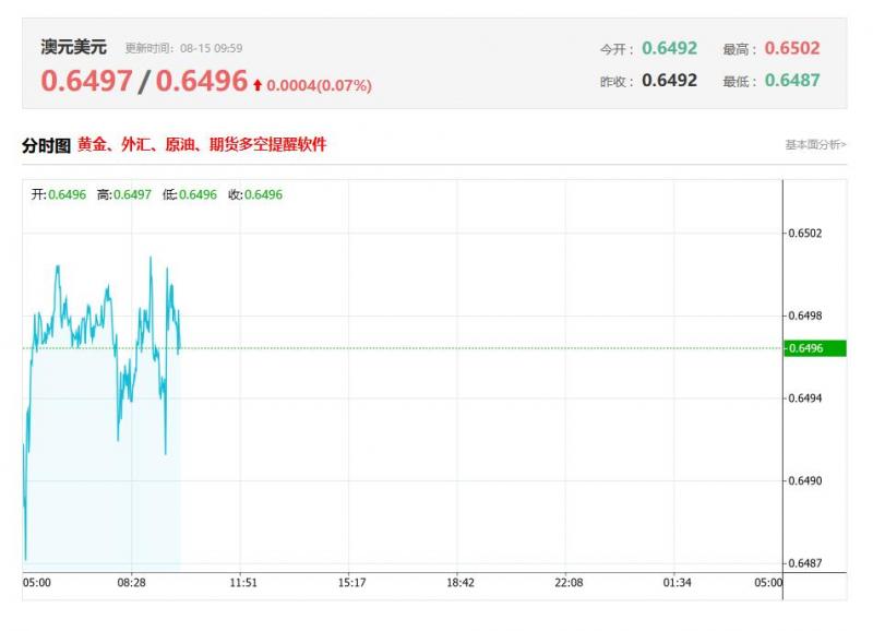 截至目前,澳元/美元上涨0.07%,报0.6496。