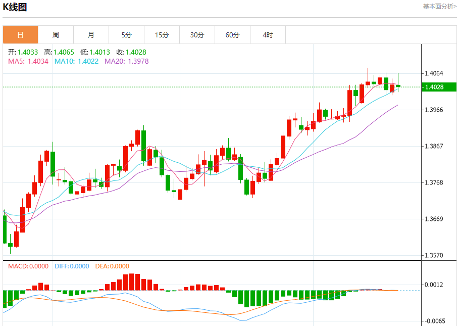 截至目前,美元/加元下跌0.04%,报1.4030。