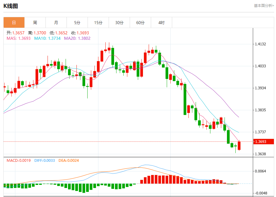 截至目前,美元/加元上涨0.15%,报1.3696。