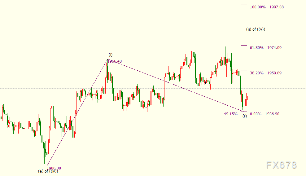 小时图上看,金价自1966美元开启的调整(ii)浪走势出现延展。若(ii)浪在1937美元终结,并开启上行(iii)浪走势,那么金价短期上方目标看向38.2%目标位1960美元。(ii)浪和(iii)浪都是自1906美元开启的上行((v))浪的子浪。