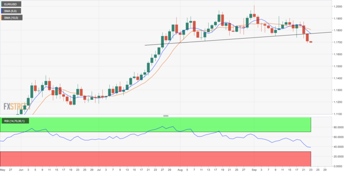而欧元/美元目前低于1.17,从1.1773跌至1.1690,证实了跌破日线图上的头肩形态。熊市反转模式为持续下跌至1.1530创造了空间。5日和10日SMA下行,14日相对强弱指数低于50或看跌,支撑了该指数的下跌。