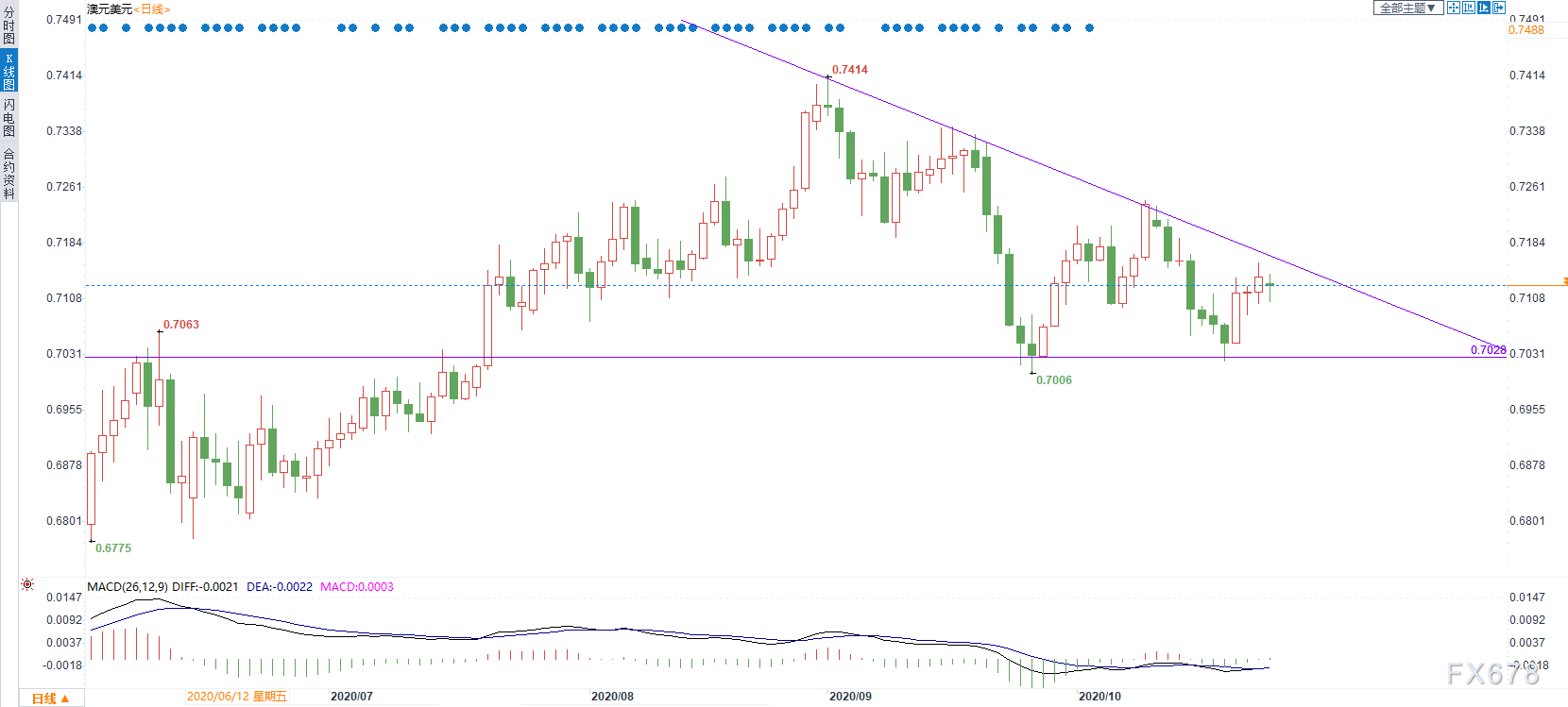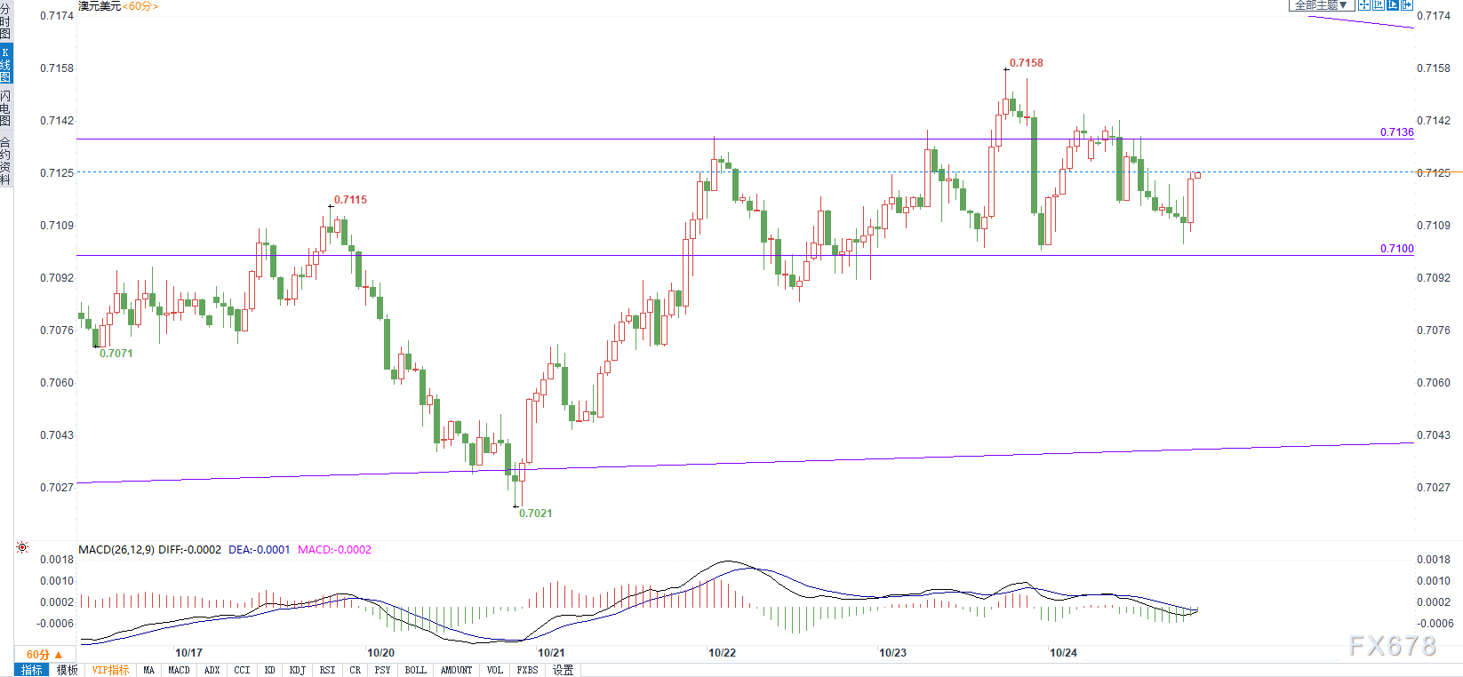 60·ÖÖÓ¼¶±ð£¬KÏß×ßÊÆÕðµ´£¬Ñ¹Á¦Î»ÔÚ0.7136¸½½ü£¬×èÁ¦Î»ÔÚ0.7100£¬ÓÉÓÚĿǰ´¦ÓÚϽµÇ÷ÊÆ£¬ÈÕÄÚ½»Ò׿ÉÒԵȴý×îÎȵ±µÄ¸ßÅ×»ú»á¡£