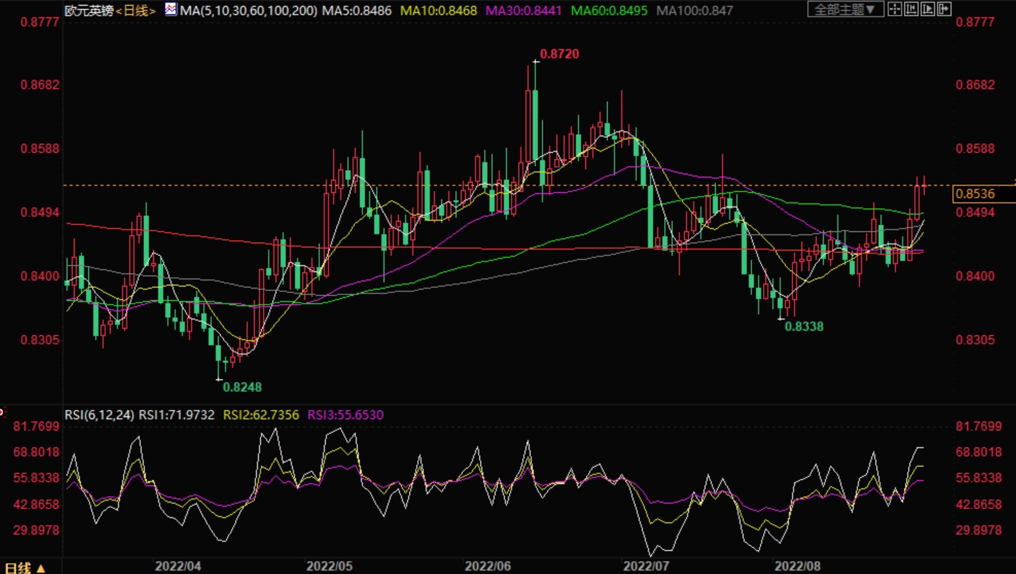 38.2%的水平接近通道中段的兴趣区域和0.8500的主要心理关口,而61.8%的斐波那契水平在移动平均线的动态支撑附近。