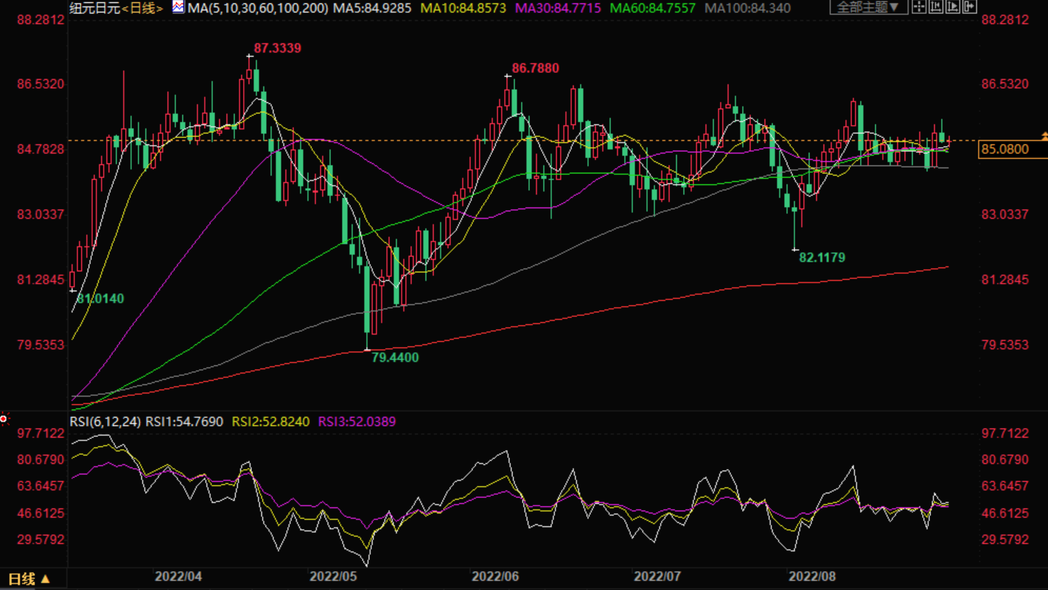 特别是该区间的顶部在85.00主要心理关口附近,这与50%的斐波那契回撤水平相符。这也符合移动平均线的动态支撑,增加了它作为底部的力量。