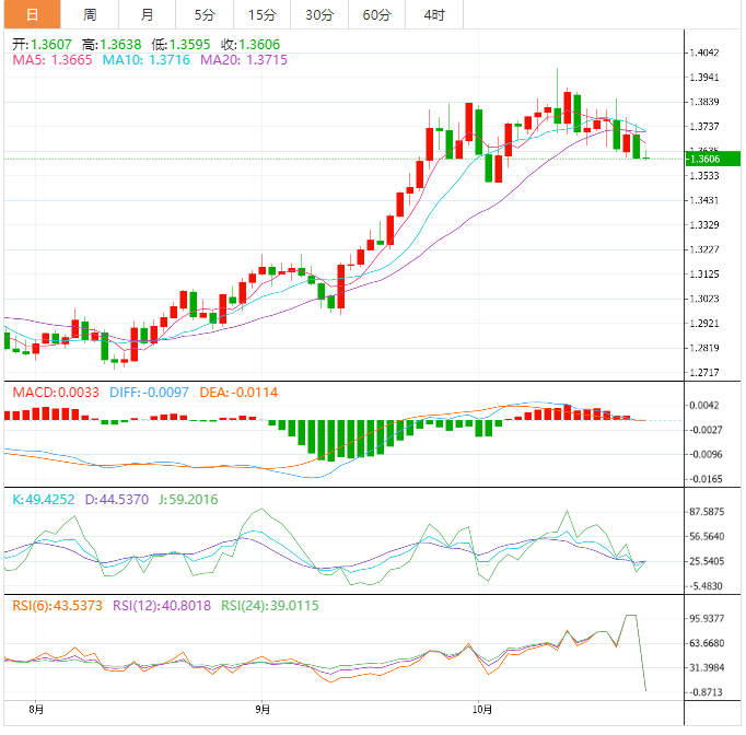 也就是说,该货币对仍有下行风险,可能接近月低位1.3502。在此之前,10月6日的最低价1.3565可能会成为买家的救星。14日相对强度指数(RSI)已经穿过了下行的中线,这意味着趋势已经转向不利于多头。