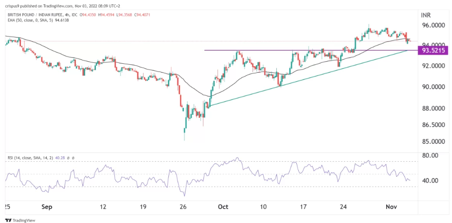 四小时图表显示,过去几周,英镑兑印度卢比的价格一直处于看涨趋势。最近,该货币对已从96.10的高点回落至94.12的低点。该价格略高于重要支撑位93.52,这是10月24日的最高水平。