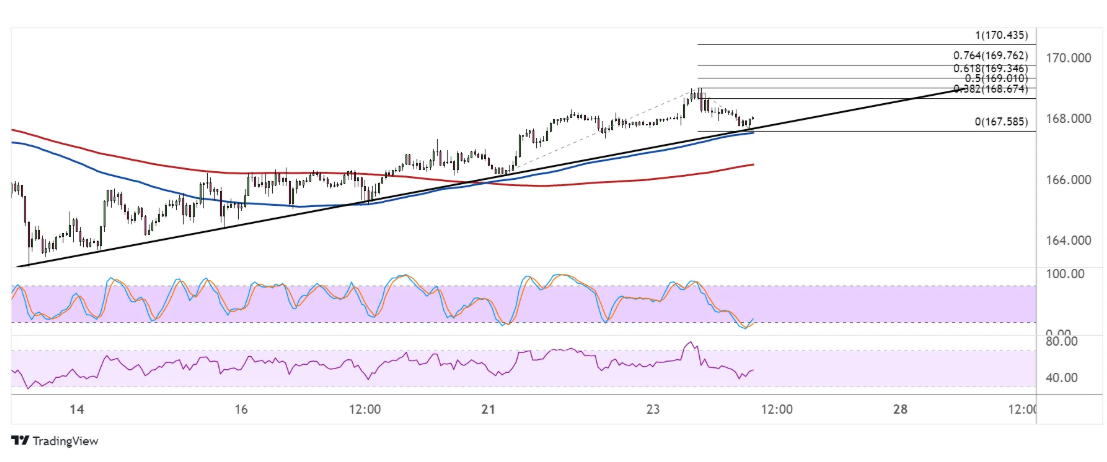 38.2%的水平是在168.67,然后50%的水平是在169.00的主要心理标记附近的摆动高点。更强劲的看涨势头可能会使英镑兑日元升至61.8%的Fib水平169.35,或76.4%的水平169.76。完整扩展值为170.43。