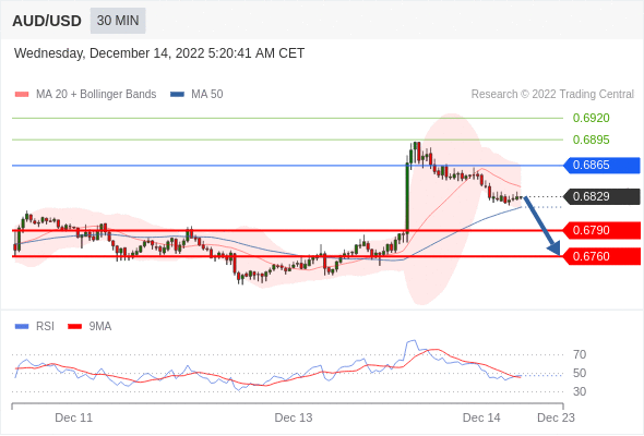 澳元/美元汇率今日分析:在 0.6865之下,看跌,目标价位为 0.6790 ,然后为 0.6760 。在 0.6865 上,看涨,目标价位定在 0.6895 ,然后为 0.6920。