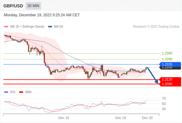 英镑/美元汇率今日分析:在 1.2225 之下,看跌,目标价位为 1.2120 ,然后为 1.2090 。在 1.2225 上,看涨,目标价位定在 1.2260 ,然后为 1.2300。
