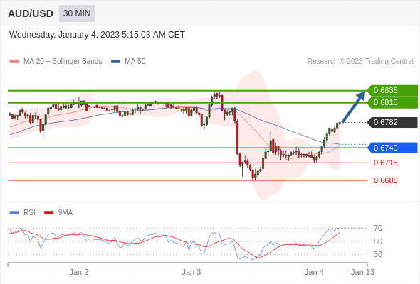 澳元/美元汇率今日分析:在 0.6740 之上,看涨,目标价位为 0.6815 ,然后为 0.6835 。在 0.6740 下,看空,目标价位定在 0.6715 ,然后为 0.6685。