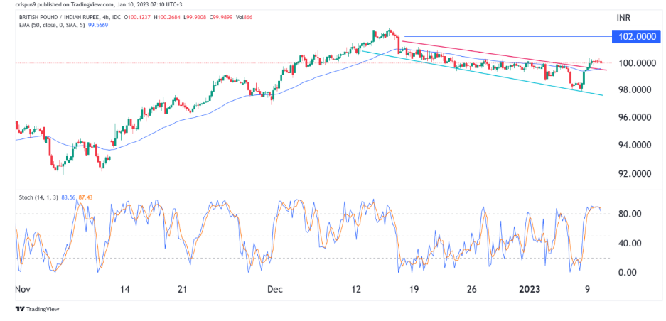 四小时图表显示,英镑/印度卢比汇率在过去几周出现了看涨突破。它成功地越过了红色所示的下降通道,该货币对也略微高于25日和50日移动均线,而随机振荡指标已经超过超买水平。