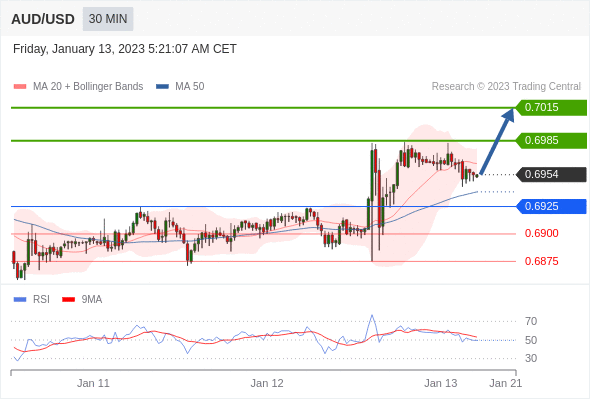 澳元/美元汇率今日分析:在 0.6925 之上,看涨,目标价位为 0.6985 ,然后为 0.7015 。在 0.6925 下,看空,目标价位定在 0.6900 ,然后为 0.6875。