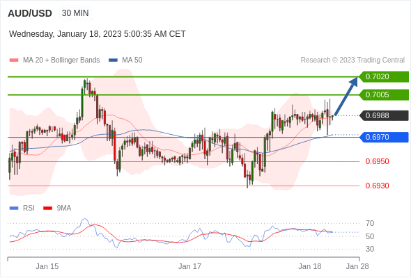 澳元/美元汇率今日分析:在 0.6970 之上,看涨,目标价位为 0.7005 ,然后为 0.7020 。在 0.6970 下,看空,目标价位定在 0.6950 ,然后为 0.6930。