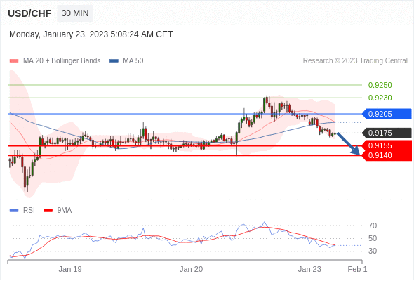 周一(1月23日)盘中, 美元/瑞郎暂报0.9181,跌0.0021,跌幅0.23%。