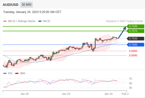 澳元/美元汇率今日分析:在 0.7000 之上,看涨,目标价位为 0.7075 ,然后为 0.7100 。 在 0.7000 下,看空,目标价位定在 0.6965 ,然后为 0.6940。
