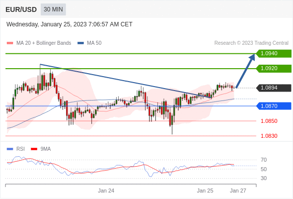 欧元/美元汇率今日分析:1.0870 上方建立多头头寸,目标在 1.0920 和 1.0940延伸。另一种情况:低于1.0870,寻找进一步的下行空间,目标为1.0850和1.0830。