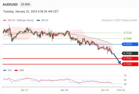 澳元/美元汇率今日分析:在 0.7070 之下,看跌,目标价位为 0.7020 ,然后为 0.7000 。在 0.7070 上,看涨,目标价位定在 0.7090 ,然后为 0.7110。