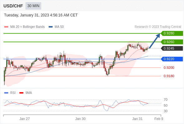 美元/瑞郎汇率今日分析:在 0.9220 之上,看涨,目标价位为 0.9260 ,然后为 0.9280 。在 0.9220 下,看空,目标价位定在 0.9200 ,然后为 0.9180。