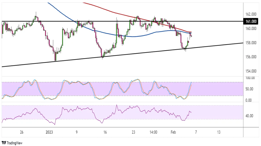 在显示超买状况或卖方枯竭之前,随机指标还有一些攀升空间,因此可能会有一些买入压力将该货币对推高至三角形阻力位。在达到超买区域之前,相对强弱指数还有更多的空间要覆盖。