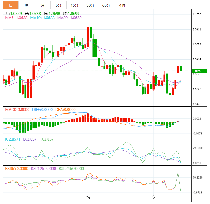 欧元/美元价格从2月份的低点1.0537大幅反弹,此后一直强势走高。美元走软推动欧元兑美元突破1.0700心理关口,这是日线图上经过多次测试的整数关口。