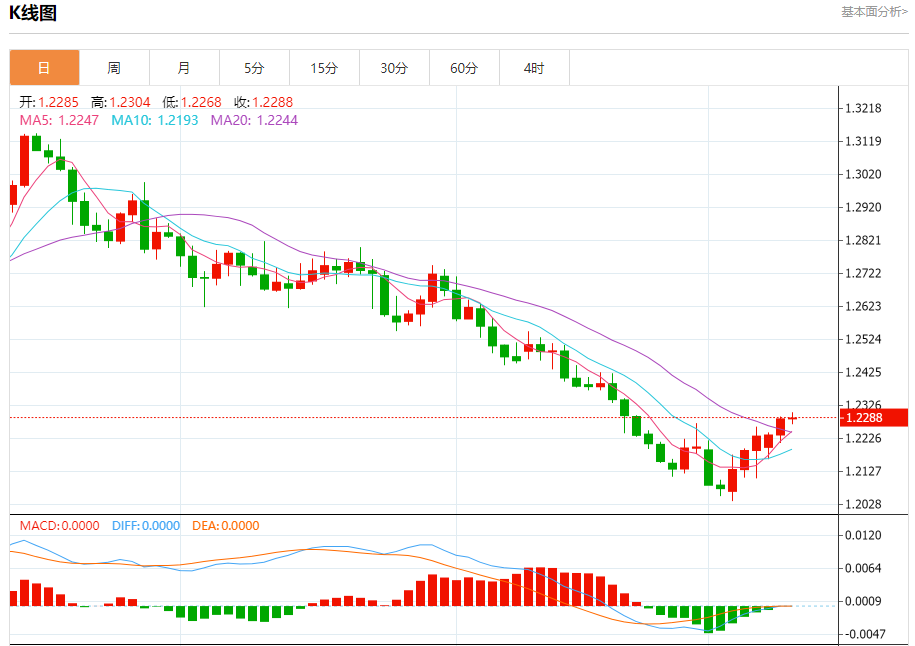 周三盘中,英镑/美元报1.2288,涨幅0.02%。