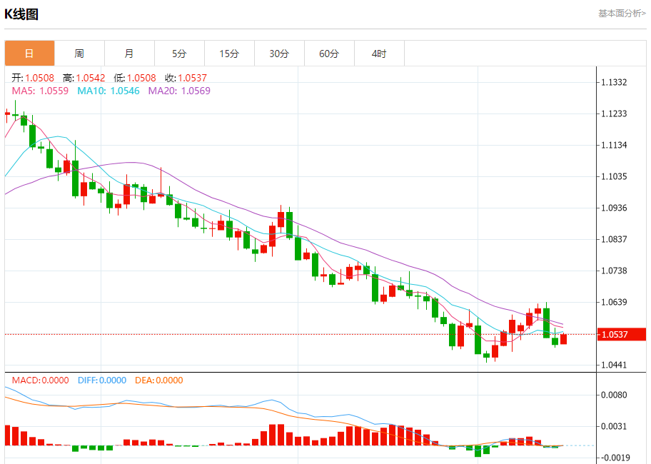 周一盘中,欧元/美元报1.0537,涨幅0.30%。