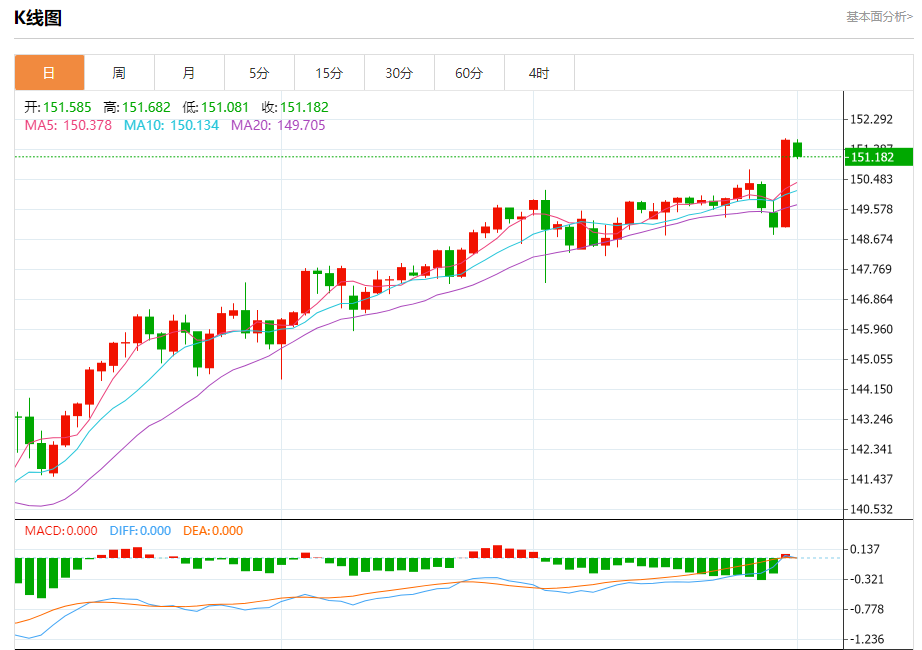 周三盘中,美元/日元报151.184,跌幅0.32%。